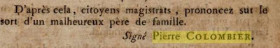 2) Pierre COLOMBIER (1762-1846), grand-père d’un autre Pierre COLOMBIER, lui-même grand-père de Jeanne COLOMBIER épouse FERLUS, dans le bulletin des jugements du 2 vendémière de l’An III (soit septembre 1794):